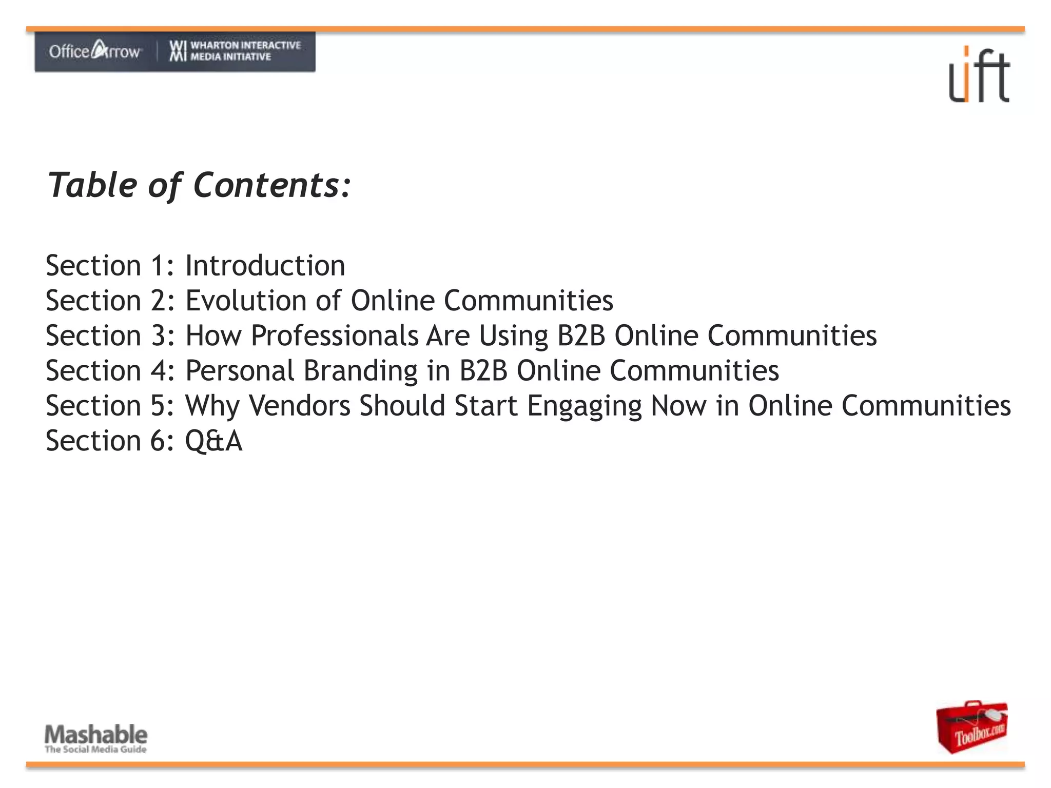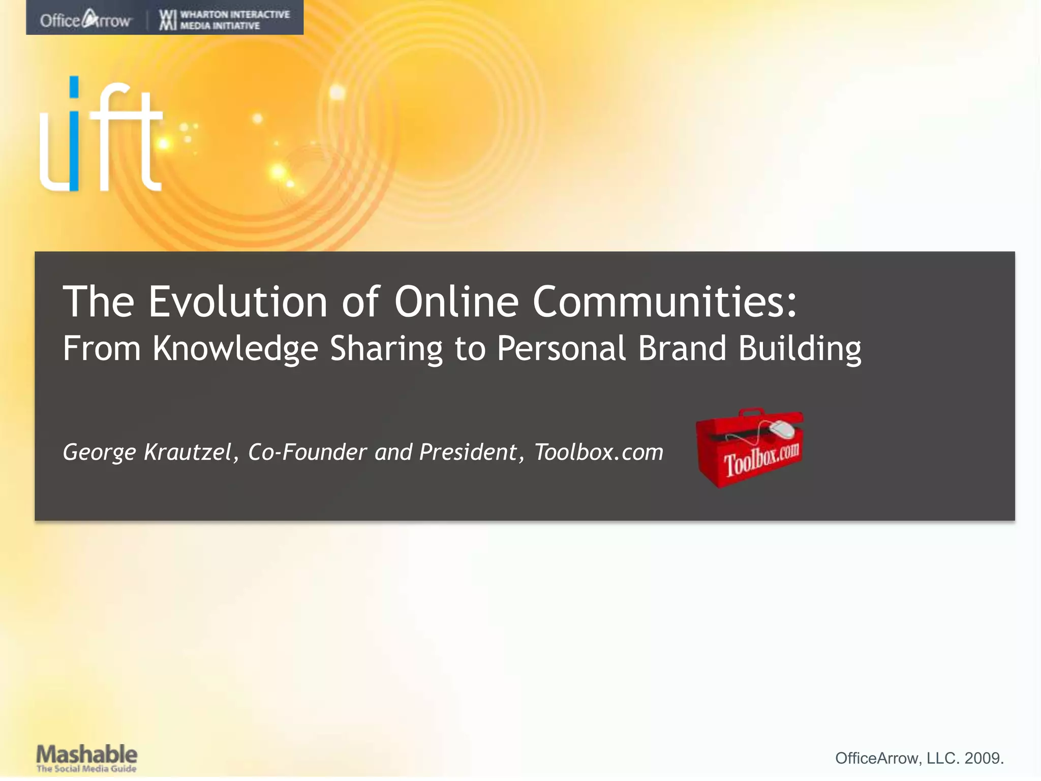 The document discusses the evolution of online communities from knowledge sharing to personal branding, highlighting how professionals leverage B2B communities for productivity and career management. It emphasizes the importance of active participation in shaping personal and corporate brands, as well as the role of vendors in engaging with these communities. The text also provides insights into effective community strategies for enhancing brand awareness and value creation.