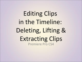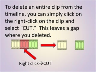 To delete an entire clip from the timeline, you can right-click on the clip and select "CUT," which leaves a gap, or right-click and select "RIPPLE EDIT" to shift the remaining clips over. You can also delete portions of clips by setting in and out points in the program window and clicking "LIFT" to leave a gap or "EXTRACT" to shift clips and remove the in and out points.