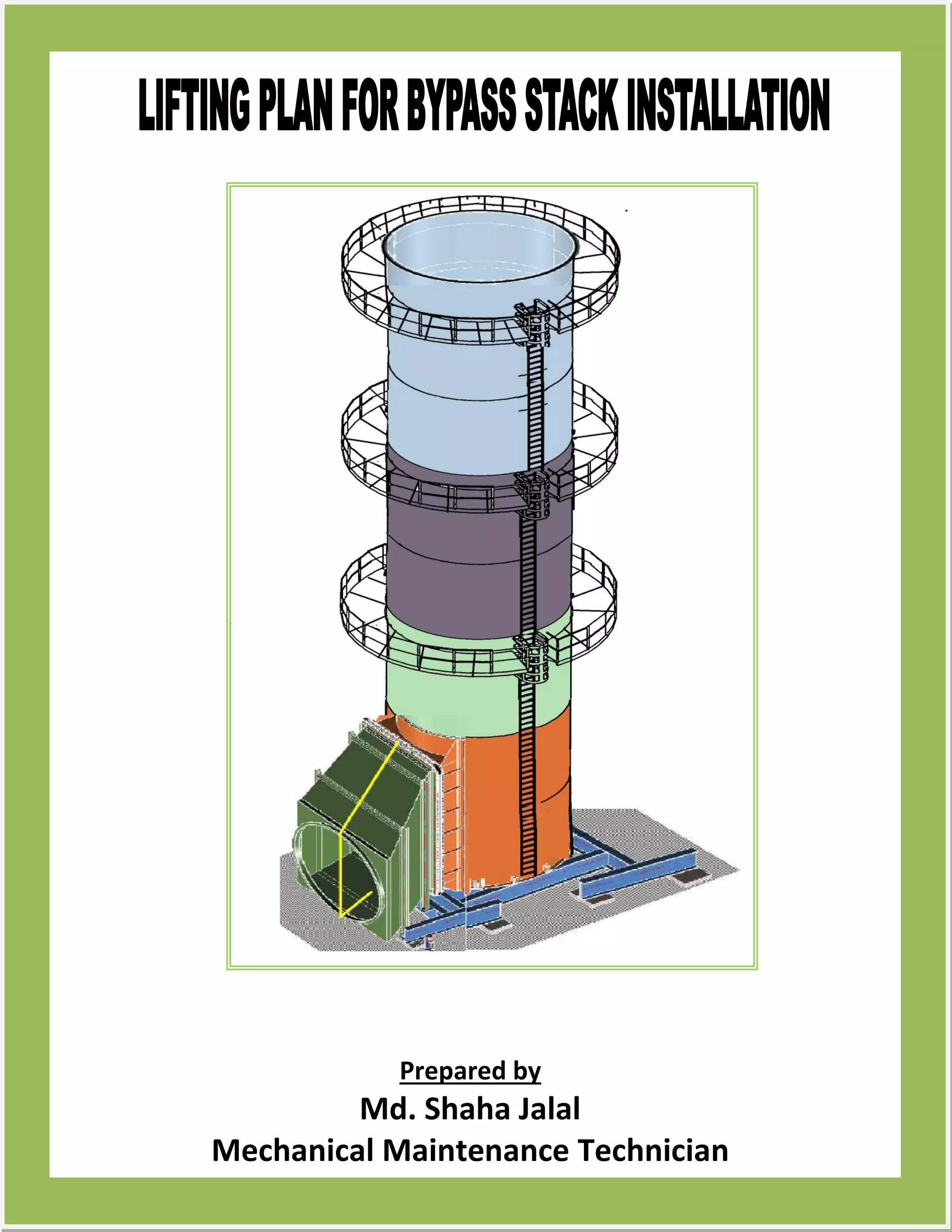 The document outlines a lifting plan for a bypass stack using various cranes and rigging equipment, detailing specifications, capacities, and procedures for lifting different parts of the stack. It identifies the use of a 150-ton and a 100-ton crane for specific lifting operations while providing calculations for lifting heights and load weights. Additionally, it includes descriptions of the arrangement and operation of lifting accessories and procedures for moving the bypass stack components to their designated locations.