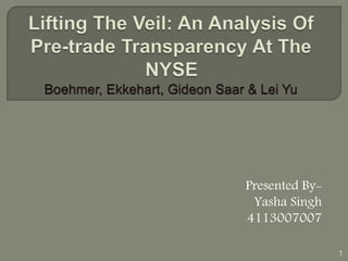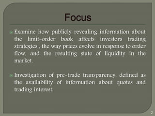 The document examines how revealing information about the limit-order book affects trading strategies, price evolution, and liquidity. It analyzes data from before and after a change in policy that increased pre-trade transparency by making more order book information available. The analysis looks at how trading strategies, price efficiency, and liquidity changed as a result. Statistical tests like median comparisons and regressions are used to analyze the effects of the increased transparency. The findings suggest that while investors did not significantly change their strategies, greater pre-trade transparency allowed for more complex trading strategies and improved liquidity.