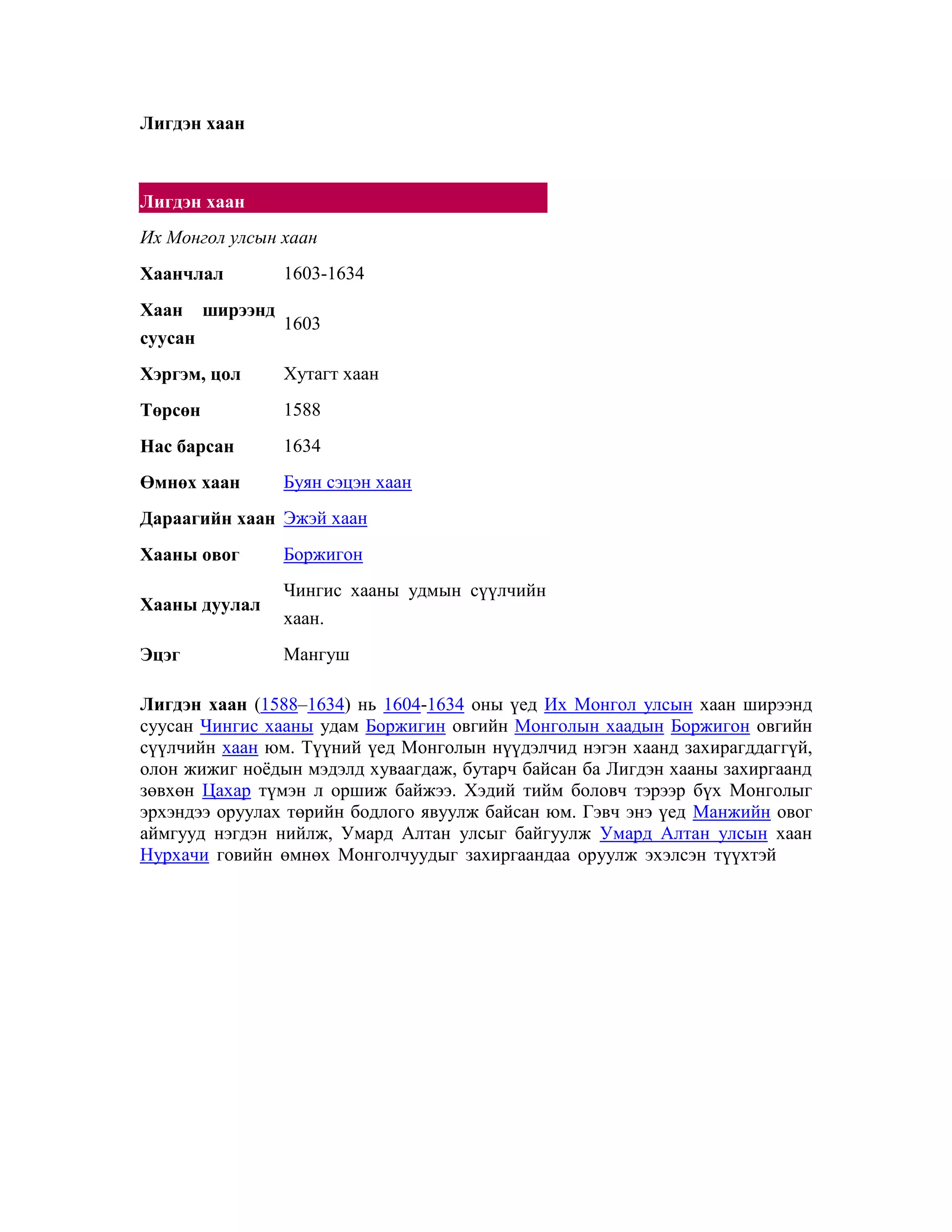 Лигдэн хаан<br /><br />Лигдэн хаанИх Монгол улсын хаанХаанчлал1603-1634Хаан ширээндсуусан1603Хэргэм, цолХутагт хаанТөрсөн1588Нас барсан1634Өмнөх хаанБуян сэцэн хаанДараагийн хаанЭжэй хаанХааны овогБоржигонХааны дуулалЧингис хааны удмын сүүлчийн хаан.ЭцэгМангуш<br />Лигдэн хаан (1588–1634) нь 1604-1634 оны үед Их Монгол улсын хаан ширээнд суусан Чингис хааны удам Боржигин овгийн Монголын хаадын Боржигон овгийн сүүлчийн хаан юм. Түүний үед Монголын нүүдэлчид нэгэн хаанд захирагддаггүй, олон жижиг ноёдын мэдэлд хуваагдаж, бутарч байсан ба Лигдэн хааны захиргаанд зөвхөн Цахар түмэн л оршиж байжээ. Хэдий тийм боловч тэрээр бүх Монголыг эрхэндээ оруулах төрийн бодлого явуулж байсан юм. Гэвч энэ үед Манжийн овог аймгууд нэгдэн нийлж, Умард Алтан улсыг байгуулж Умард Алтан улсын хаан Нурхачи говийн өмнөх Монголчуудыг захиргаандаа оруулж эхэлсэн түүхтэй<br />Гүүш хаан <br /> <br />Гүүш хаан (1582 - 1654) буюу Төрбайх нь 17-р зууны дунд үед Монголын дөрвөн Ойрадын нэг болох Хошуудын удирдагч байсан төрийн зүтгэлтэн юм.<br />5-р далай ламын хүсэлтээр 1637 онд Хөх нуурт Цогт хунтайжийн цэргийг ялан, далай ламаас \"