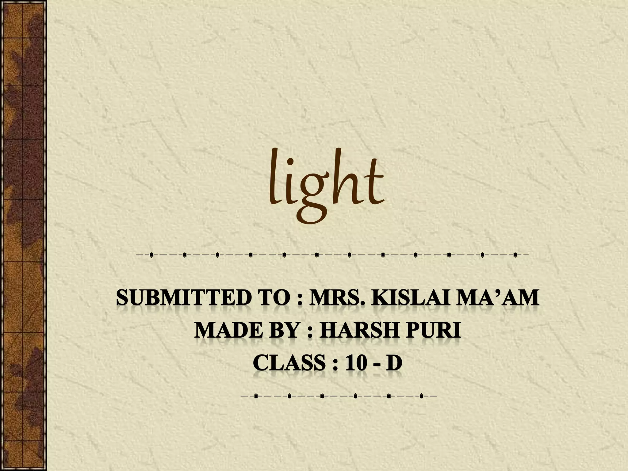 Light is part of the electromagnetic spectrum that is visible to the human eye. It travels in straight lines called rays. Luminous objects like light bulbs and the sun emit their own light, while non-luminous objects like tables reflect light. Reflection is when light rays bounce off a surface, following the laws that the angle of incidence equals the angle of reflection and the reflected ray, incident ray, and normal all lie in the same plane. Refraction is when light changes speed and direction when passing from one medium to another due to differences in optical density, following Snell's law relating the sines of the angles of incidence and refraction. This causes phenomena like objects in water appearing bent and pools seeming shal