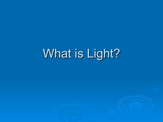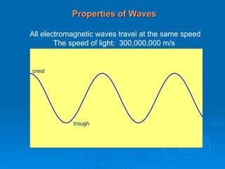Light can be described as both a wave and a particle. As a wave, it travels at 300 million meters per second and is characterized by its wavelength and frequency. The different wavelengths of light make up the electromagnetic spectrum, from radio waves to gamma rays. As the frequency increases, so does the energy of the electromagnetic waves. Light also behaves as particles called photons, which are emitted or absorbed in specific wavelengths by electrons in atoms. This allows spectroscopy to be used to determine the composition of different objects by their emission or absorption spectra.