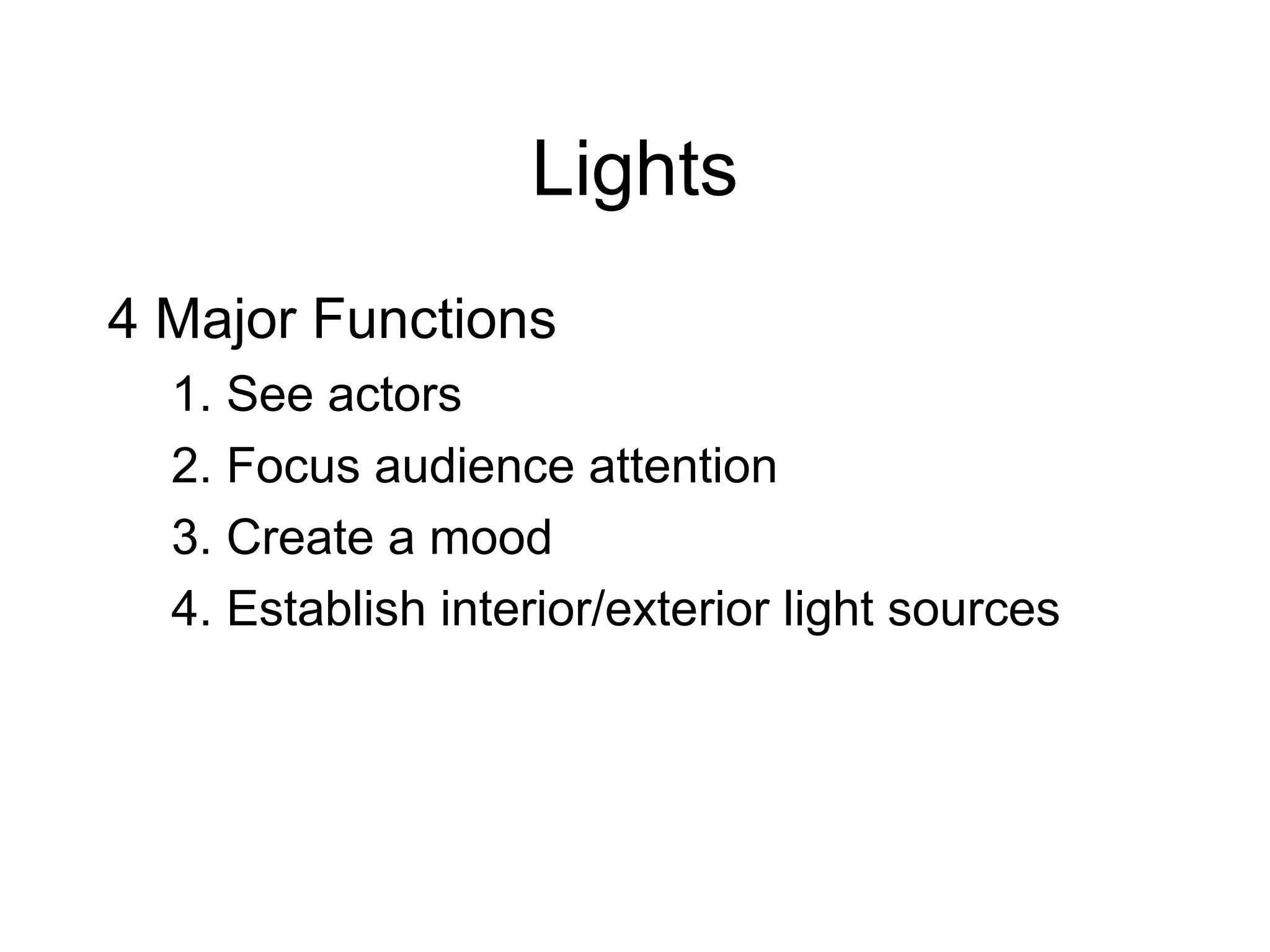 This document discusses the functions and processes of lighting and sound design for theatre. It explains that lights are used to see actors, focus audience attention, create mood, and establish interior/exterior sources. Specific lighting instruments like spots, washes and gels are discussed. The lighting design process involves reading the script, meeting with the director, creating a light plot and cue sheet. For sound design, the major functions are establishing mood, providing realistic sounds, and situating the audience. The document discusses using music and effects to set mood and provide realism. The sound design process is similar to lighting, involving script analysis and creating a cue sheet.