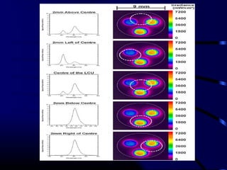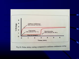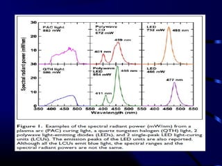 This document discusses composite light curing units. It begins by introducing light activated resin systems and the advantages of light cure composites over self cure. It describes the components of light cure composites including camphorquinone and amine activators. The document then covers the characteristics of curing light, types of light curing units including quartz tungsten halogen, plasma arc, laser and LED lights. It discusses factors that influence polymerization such as exposure time, irradiance, and techniques like continuous and discontinuous curing.