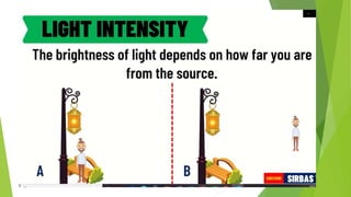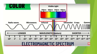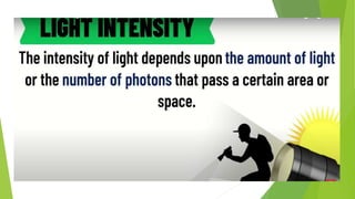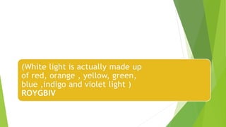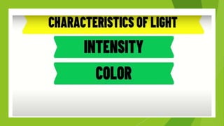 The document discusses the characteristics and properties of light. It begins by asking questions about light and its behaviors. It then covers key topics like the electromagnetic spectrum, photon theory, and wave-particle duality of light. The document explores the visible light spectrum and different colors of light (red, orange, yellow, green, blue, indigo, violet) which are defined by their frequencies and wavelengths. It emphasizes the importance of light in everyday life, such as for plant growth. Students are then quizzed to evaluate their understanding of topics like the relationship between energy, frequency, and wavelength across the different colors of light.