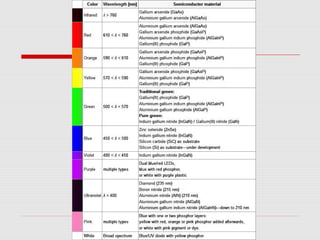Dokumen ini menjelaskan tentang diod pemancar cahaya (LED) yang berfungsi melalui pergerakan elektron dan lohong dalam semikonduktor, yang menghasilkan cahaya ketika elektron jatuh ke paras tenaga yang lebih rendah. Warna cahaya yang dihasilkan bergantung kepada tenaga foton yang dikeluarkan. Untuk menghubungkan LED, diperlukan voltan 1.5~2.5v dan arus 10 ma, serta resistor 470 Ω untuk mengelakkan beban berlebihan.
