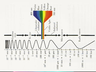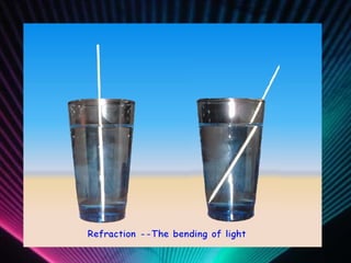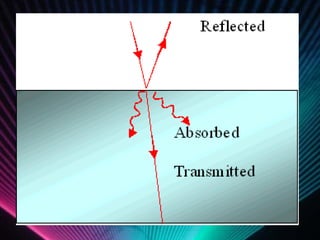 Light energy is electromagnetic radiation consisting of electrical and magnetic energy. It is emitted by electrons in objects and travels in waves across the electromagnetic spectrum. Absorption occurs when light is not reflected or transmitted by an object, with different colors absorbed and reflected. Reflection is when light bounces off a surface, like in mirrors. Transmission is when light passes through a medium without being absorbed or scattered. Refraction is the bending of light waves changing direction as they pass between substances. Scattering causes light to bounce off objects in many directions, as seen with the blue sky and halos around the sun.
