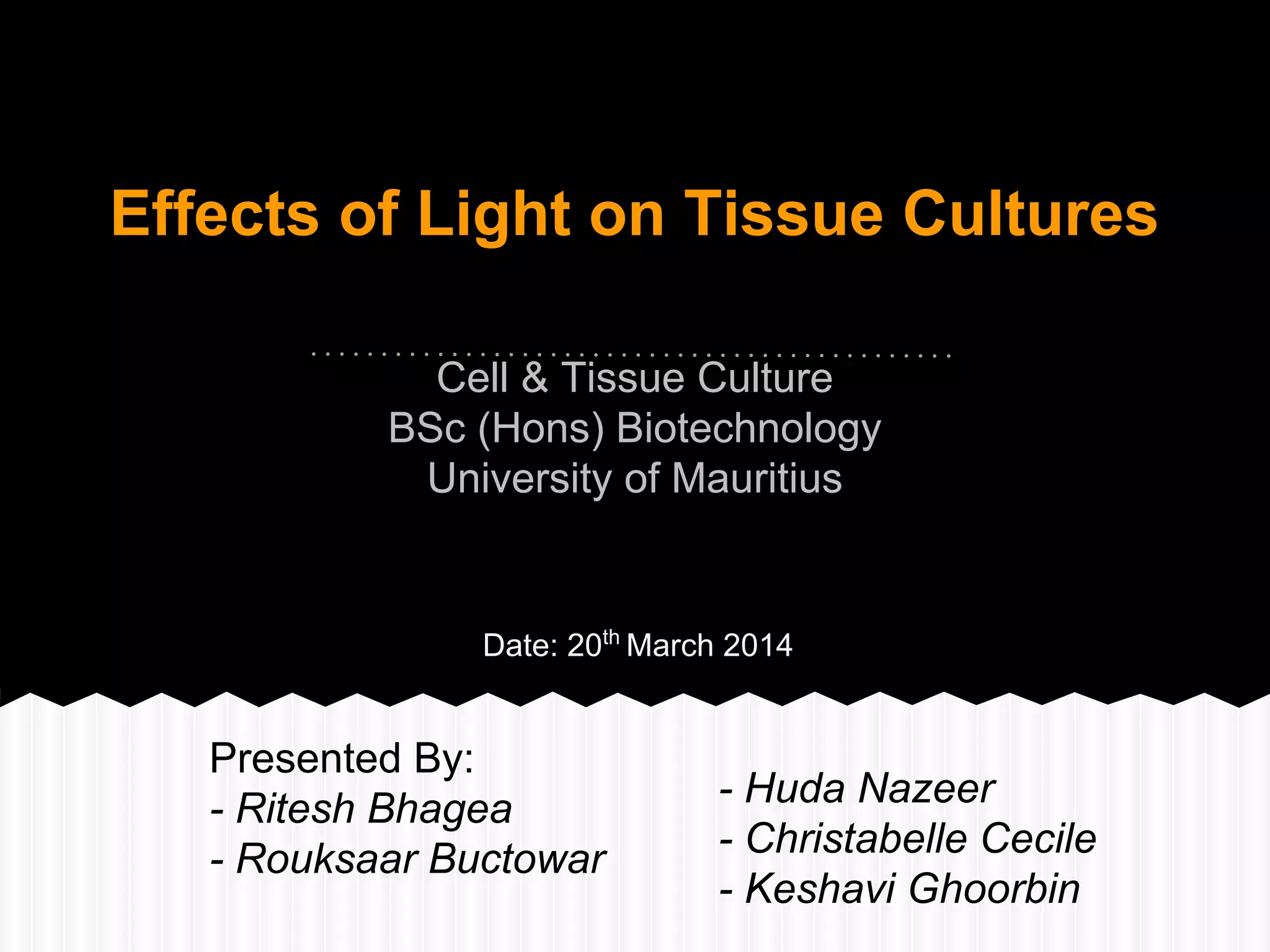 This document summarizes an experiment on the effects of light intensity on tissue cultures. The experiment measured light intensity from different sources using a luxmeter. It found that intensity increased with the number of fluorescent tubes used, and was highest for sunlight outside. Covering cultures with aluminum foil or newspaper reduced intensity. The discussion notes that low light is better for callus formation but cultures need sufficient light for photosynthesis. Improvements suggested include using LED lights and optimizing spacing and lighting conditions for cultures.