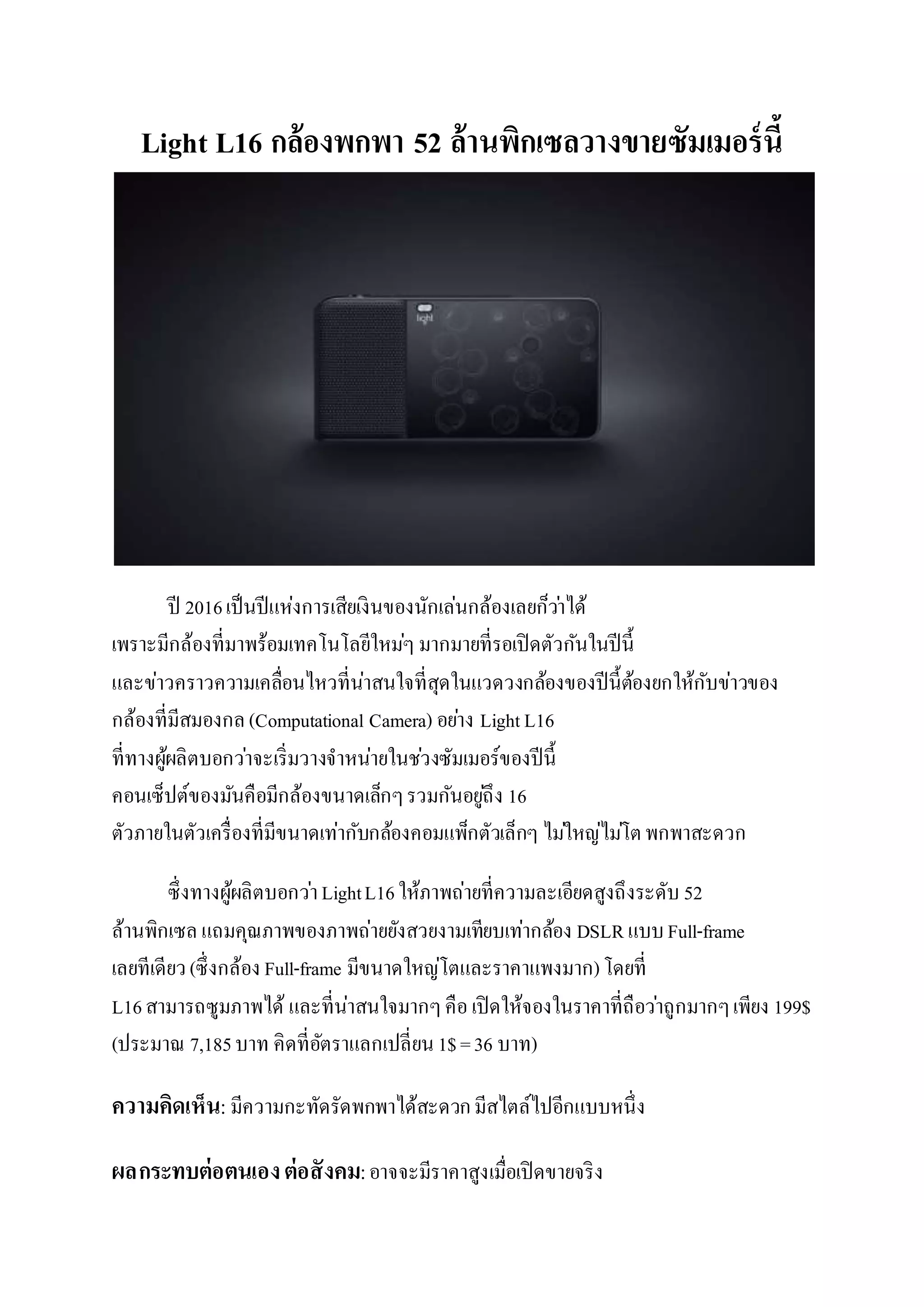 52 ล้านพิกเซลวางขายซัมเมอร์นี้ ปี 2016เป็นปีแห่งการเสียเงินของนักเล่นกล้องเลยก็ว่าได้ เพราะมีกล้องที่มาพร้อมเทคโนโลยีใหม่ๆ มากมายที่รอเปิดตัวกันในปีนี้ และข่าวคราวความเคลื่อนไหวที่น่าสนใจที่สุดในแวดวงกล้องของปีนี้ต้องยกให้กับข่าวของ กล้องที่มีสมองกล(Computational Camera) อย่าง LightL16 ที่ทางผู้ผลิตบอกว่าจะเริ่มวางจาหน่ายในช่วงซัมเมอร์ของปีนี้ คอนเซ็ปต์ของมันคือมีกล้องขนาดเล็กๆรวมกันอยู่ถึง 16 ตัวภายในตัวเครื่องที่มีขนาดเท่ากับกล้องคอมแพ็กตัวเล็กๆ ไม่ใหญ่ไม่โตพกพาสะดวก ซึ่งทางผู้ผลิตบอกว่าLightL16ให้ภาพถ่ายที่ความละเอียดสูงถึงระดับ 52 ล้านพิกเซล แถมคุณภาพของภาพถ่ายยังสวยงามเทียบเท่ากล้อง DSLRแบบFull-frame เลยทีเดียว(ซึ่งกล้อง Full-frame มีขนาดใหญ่โตและราคาแพงมาก)โดยที่ L16สามารถซูมภาพได้ และที่น่าสนใจมากๆคือเปิดให้จองในราคาที่ถือว่าถูกมากๆเพียง 199$ (ประมาณ 7,185บาท คิดที่อัตราแลกเปลี่ยน1$=36 บาท) ความคิดเห็น: มีความกะทัดรัดพกพาได้สะดวกมีสไตล์ไปอีกแบบหนึ่ง ผลกระทบต่อตนเองต่อสังคม:อาจจะมีราคาสูงเมื่อเปิดขายจริง
