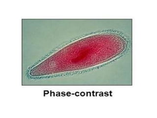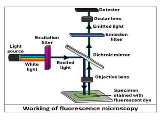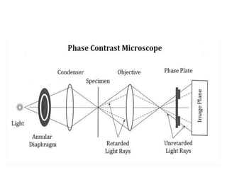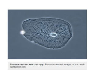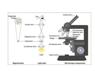 The document provides an overview of light microscopes, including their history and key components. It discusses how the first microscopes were developed in the 1600s using simple lenses. Modern light microscopes use lenses to magnify specimens up to 1000x their actual size and include features like brightfield, darkfield, phase contrast and fluorescence microscopy. Brightfield microscopes produce a dark image on a bright background while darkfield shows bright specimens on a dark background. Microscopy has many applications in diagnostic microbiology like rapid identification of pathogens and determination of clinical significance.