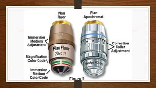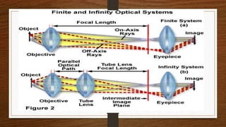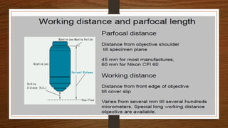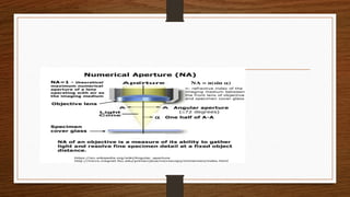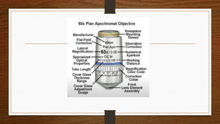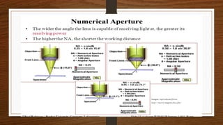 The document provides an extensive overview of light microscopy, including its history and key figures such as Hans Janssen, Galileo, Robert Hooke, and Anton van Leeuwenhoek. It discusses the principles of light’s properties, refraction, reflection, and various types of lenses, as well as the components and classifications of light microscopes. Additionally, it covers concepts of magnification, resolution, numerical aperture, and the significance of various objective lenses in microscopy.