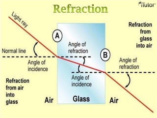 Light is electromagnetic radiation that travels at about 300,000 km/s. It can be emitted from luminous objects like stars or reflected from illuminated objects like the moon. Light carries energy and information, travels in straight lines, and can be reflected, refracted, or absorbed when interacting with objects. The human eye detects light via photoreceptors in the retina that send signals to the brain, allowing us to see color.