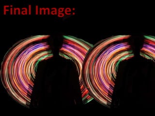This document describes how a photo was taken of someone swinging Christmas lights to create light painting and then edited in Photoshop. The background was colored black, brightness and contrast were adjusted, and hue and saturation were modified to make the lights stand out against the dark background and match the color of the obscured subject. The edited image was then duplicated.