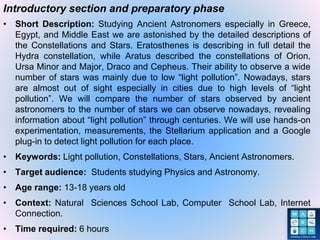 This document describes a study on light pollution conducted with students. It involves comparing the number of stars visible to ancient astronomers to those visible today using software and historical accounts. Students observe constellations like Hydra and compare the number of stars they see to descriptions by astronomers like Eratosthenes. They use a light pollution plugin for Google Earth to analyze pollution levels anciently and now. The study aims to reveal how light pollution has impacted night sky observation over centuries through hands-on investigation and evidence gathering.