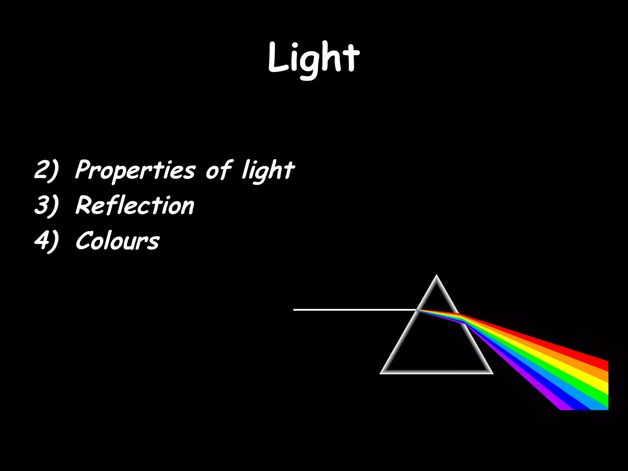 Light travels in straight lines at a speed of around 300,000 kilometres per second, much faster than sound. We see objects because they reflect light into our eyes. Shadows are formed when light is blocked by an object. Light reflects off surfaces at the same angle it hits them, following the law of reflection. White light is made up of the colors of the rainbow which can be split and recombined.