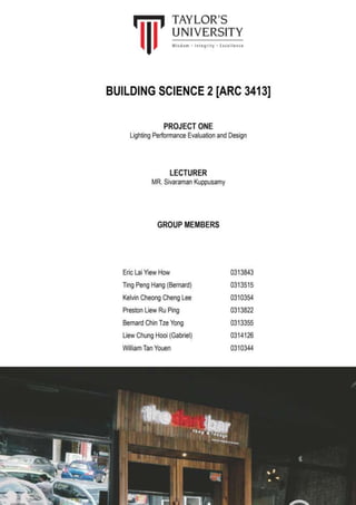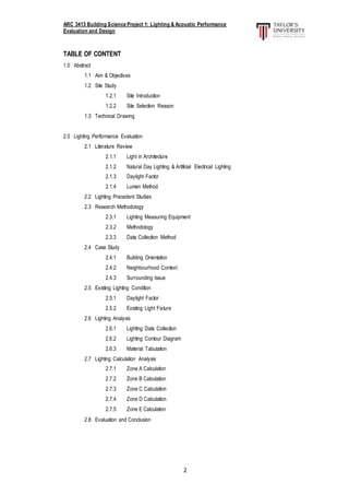 This document provides details of a study evaluating the lighting performance of The Dart Bar. It includes sections on literature review, research methodology, case study details, and analysis of the existing lighting conditions. Measurement equipment including a lux meter were used to collect lighting data from the site based on a 1.5m x 1.5m grid. Various zones within the bar were analyzed to determine illumination levels and potential improvements to the lighting design. Precedent studies were also reviewed for comparison.