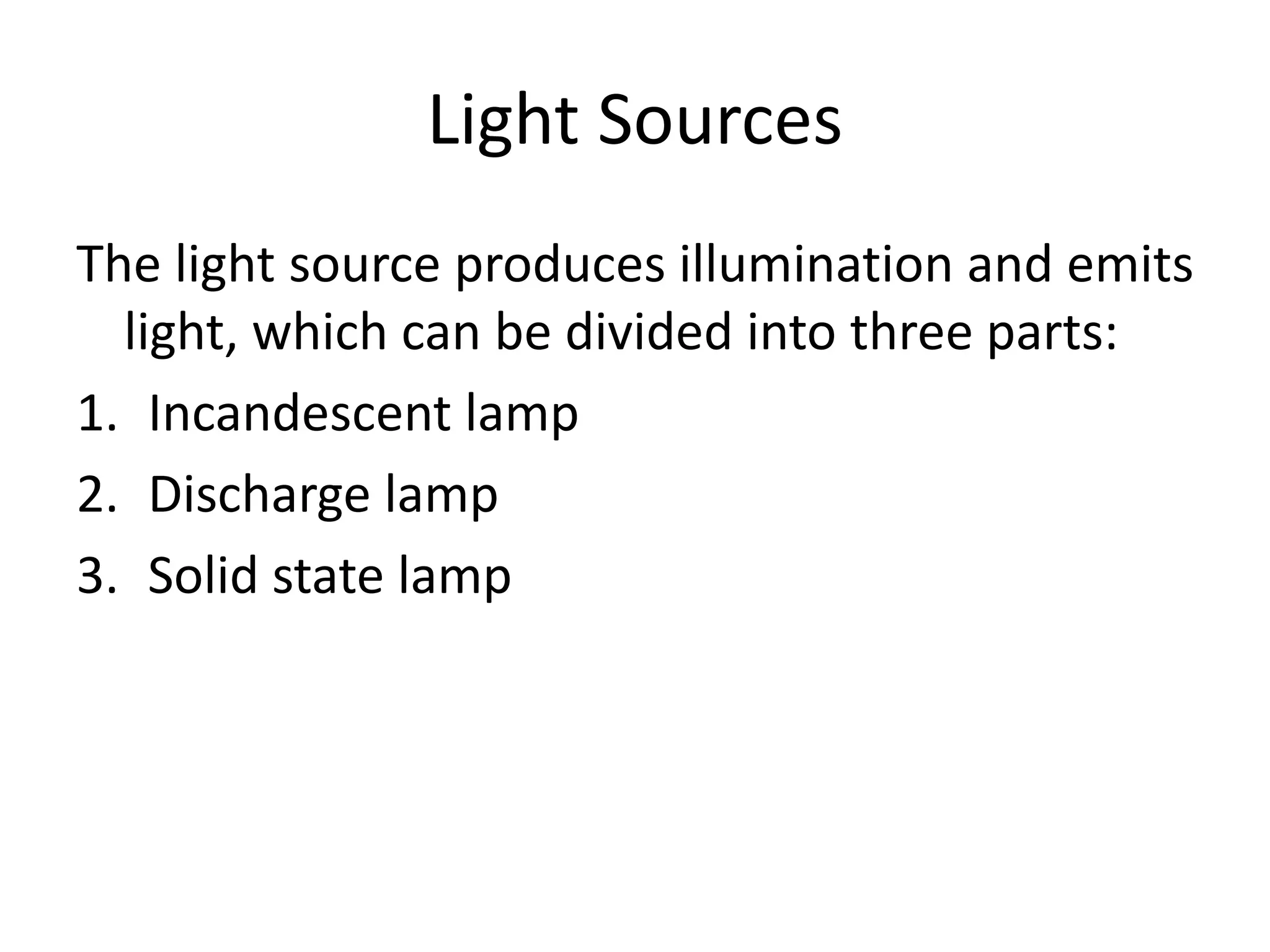 The document discusses three main types of light sources: incandescent lamps, discharge lamps, and solid state lamps. Incandescent lamps produce light through a heated filament, discharge lamps use ionized gas to produce light, and solid state lamps like LEDs use semiconductors. It then provides details on each type of light source and how they produce and emit light differently. It also discusses key characteristics used to describe light sources like spectral power distribution, color rendering index, and correlated color temperature.