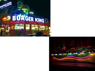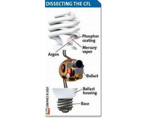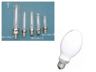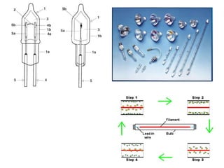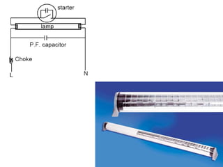 This document discusses different light sources including natural sunlight and various artificial light sources such as incandescent, fluorescent, discharge, and halogen lamps. It provides details on the operation and characteristics of these various lamp types. Incandescent lamps emit light due to the filament heating to a high temperature, while discharge lamps emit light from an electric current passing through gas. Fluorescent lamps contain mercury vapor and produce light through fluorescence of phosphor coatings.