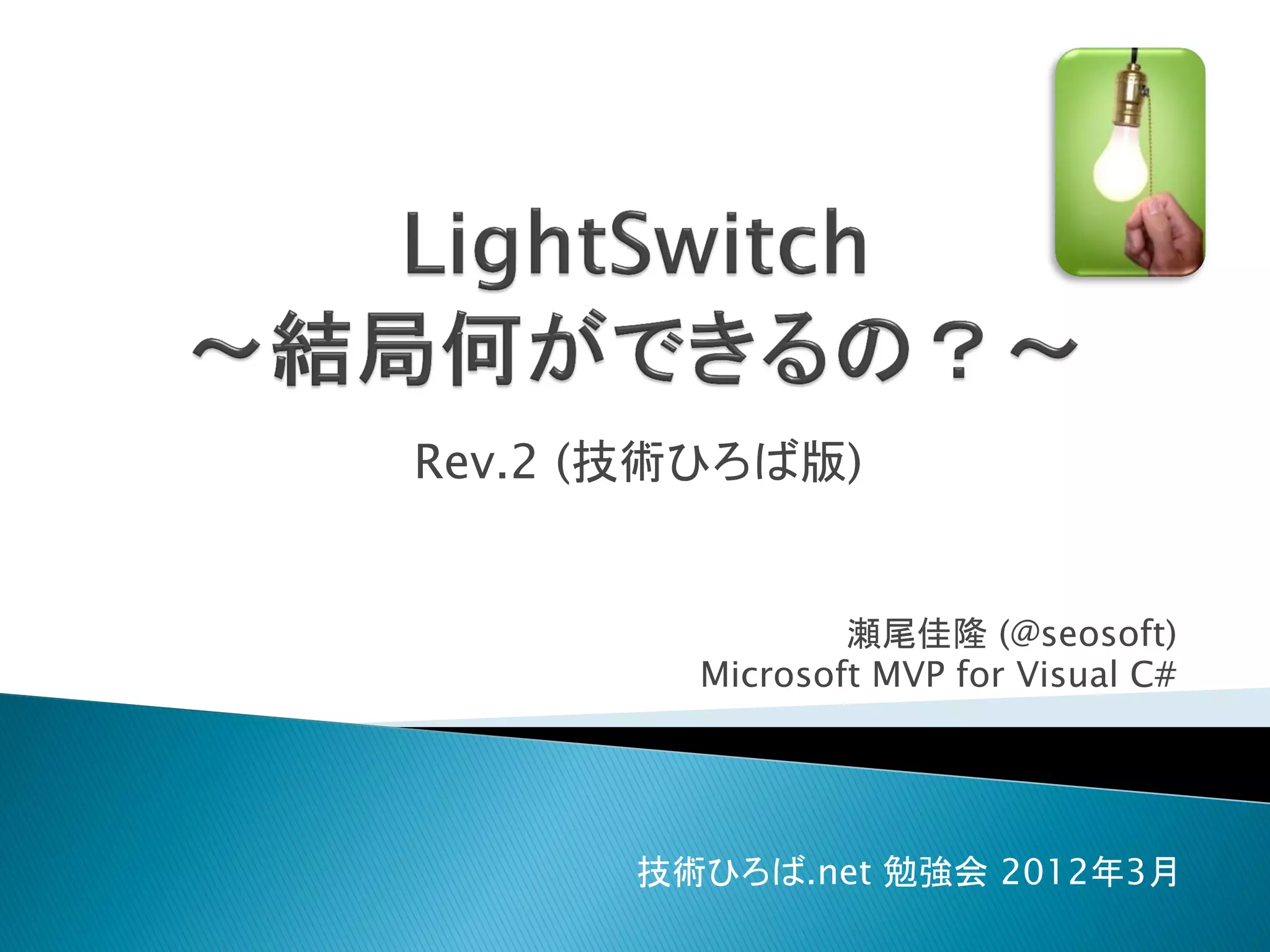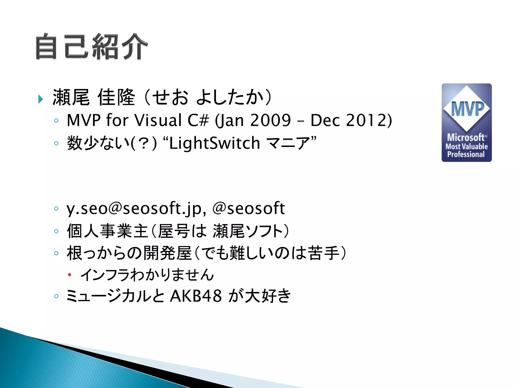 瀬尾 佳隆 (せお よしたか) ◦ MVP for Visual C# (Jan 2009 – Dec 2012) ◦ 数少ない(?) “LightSwitch マニア” ◦ y.seo@seosoft.jp, @seosoft ◦ 個人事業主(屋号は 瀬尾ソフト) ◦ 根っからの開発屋(でも難しいのは苦手) インフラわかりません ◦ ミュージカルと AKB48 が大好き