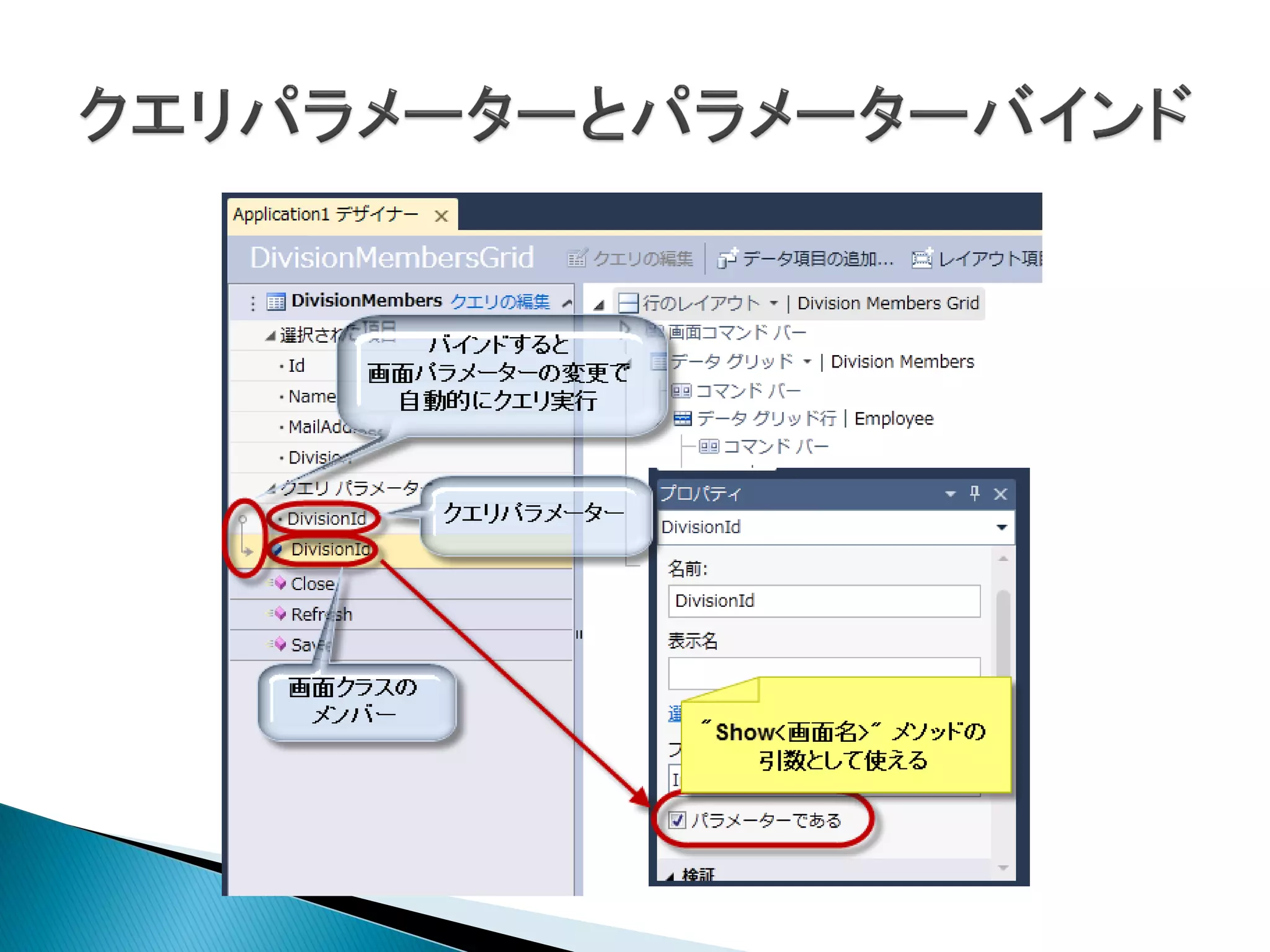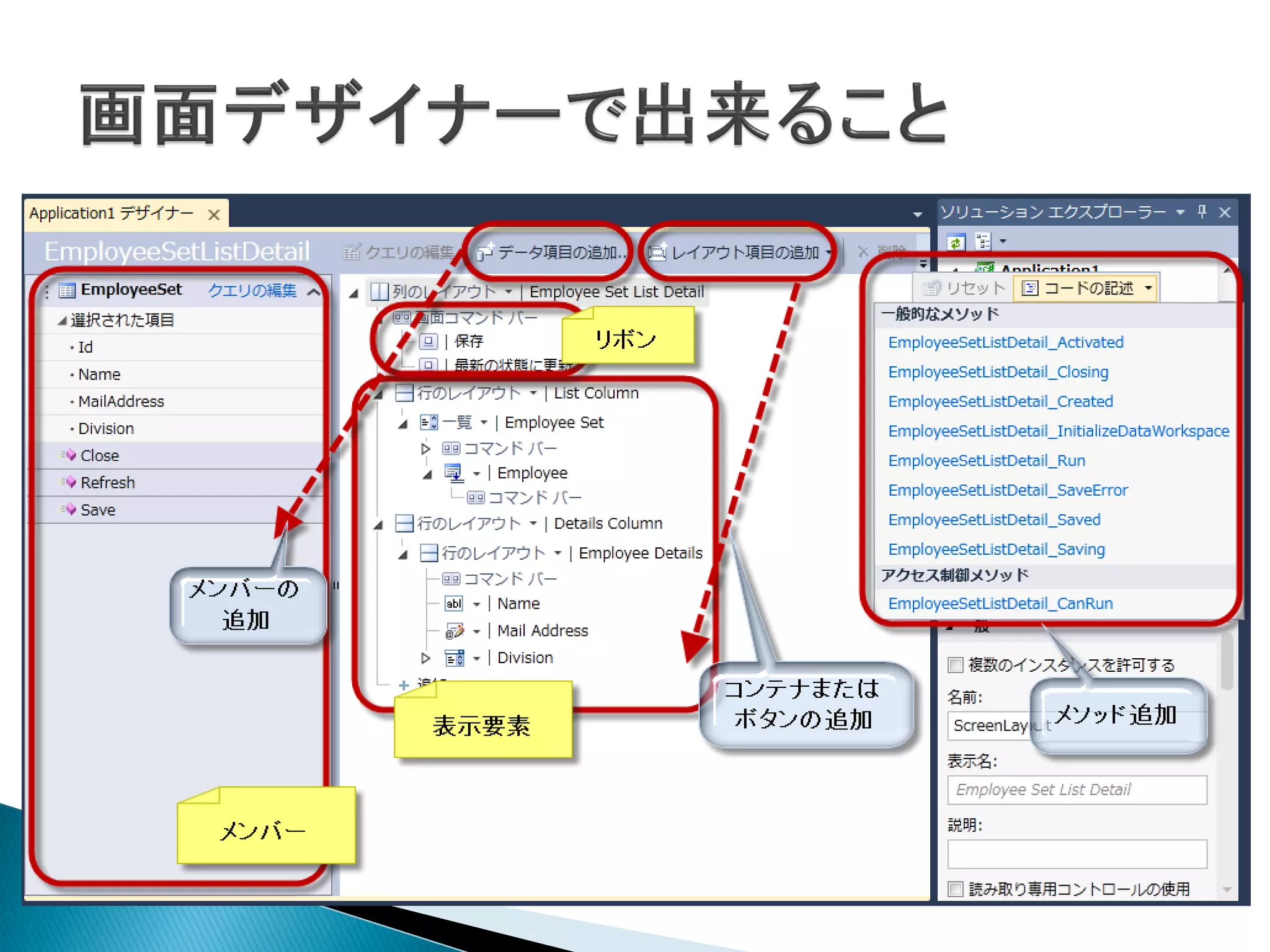 できないものもある 画面デザイナーで定義+画面クラスコード 変更不可 画面クラス データクラス コード コード 画面デザイナーで データデザイナーで (エクステンション) 定義 定義