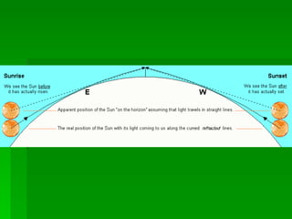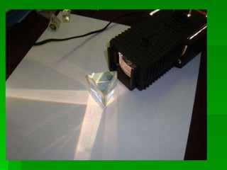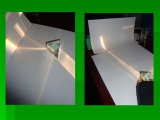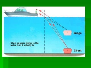 2. Refraction occurs when light travels from one medium to another of different density, causing the light to bend and change speed. This is demonstrated through experiments with glass blocks.