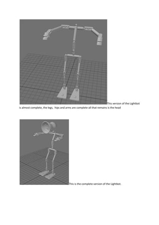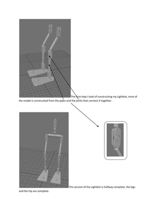 The document describes the construction of a Lightbot model in 3 steps - the first step involved constructing the model from pipes and joints, the second step had the legs and hip completed, and the third step was the completed version with the legs, hips and arms finished and just the head remaining to be added.