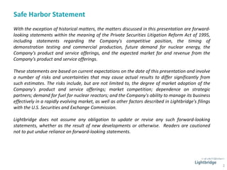 Lightbridge is developing advanced nuclear fuel designs to improve reactor safety and economics. Their metallic fuel is designed to enable higher power output, longer fuel cycles, and improved safety in existing and new reactors. Initial testing of Lightbridge fuel is planned for 2023, with commercial production expected in 2025. The fuel is projected to generate significant revenue from royalties and help meet growing global energy demand and climate goals in a cost-effective way.