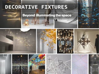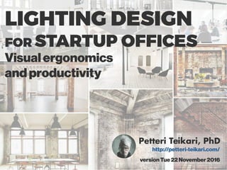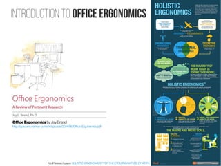 The document discusses various aspects of office ergonomics, focusing on visual ergonomics and eye fatigue due to poor lighting conditions and monitor placement. It highlights the importance of maintaining proper luminance ratios to reduce visual discomfort and emphasizes the impact of lighting design on workspace aesthetics and employee well-being. Additionally, it explores how innovative lighting design can serve as a branding tool for companies, influencing both client perceptions and recruitment efforts.