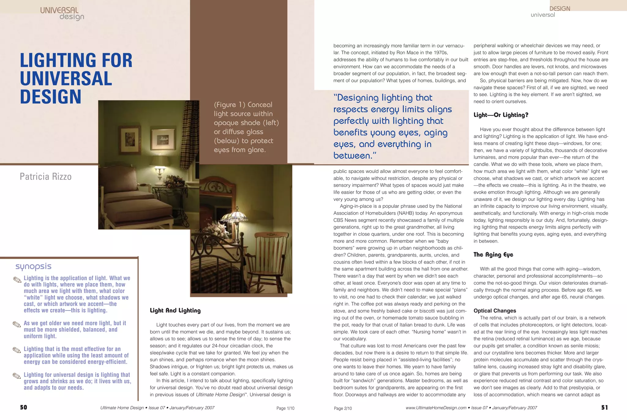 Lighting is the application of light sources in a way that considers factors like placement, amount of light, color, and shadows. As people age, they need more light but it must be balanced, uniform and shielded to avoid glare. Energy-efficient lighting produces the most light while using the least energy, such as fluorescent and LED lights which use less energy and last longer than incandescents. Lighting for universal design adapts to people's changing needs and allows them to navigate spaces safely as they age.