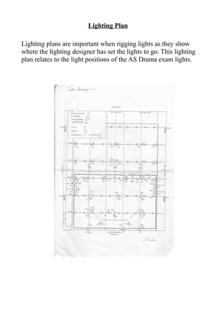 The lighting plan shows where the lighting designer has positioned lights. This particular lighting plan shows the positions of lights for an AS Drama exam. It provides the essential information of lighting positions in a concise 3 sentence summary.
