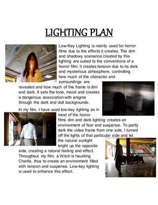 Low-key lighting is mainly used in horror films to create tension through dim, shadowy scenarios that reveal characters and surroundings in a mysterious, dark atmosphere. The document discusses how low-key lighting sets the tone and mood for danger by keeping backgrounds dark and dim. It also explains that the filmmaker used natural low-key lighting by blocking light on one side to create a feeling of fear and suspense as a witch haunts the main character, enhancing the tension and suspense throughout the film.