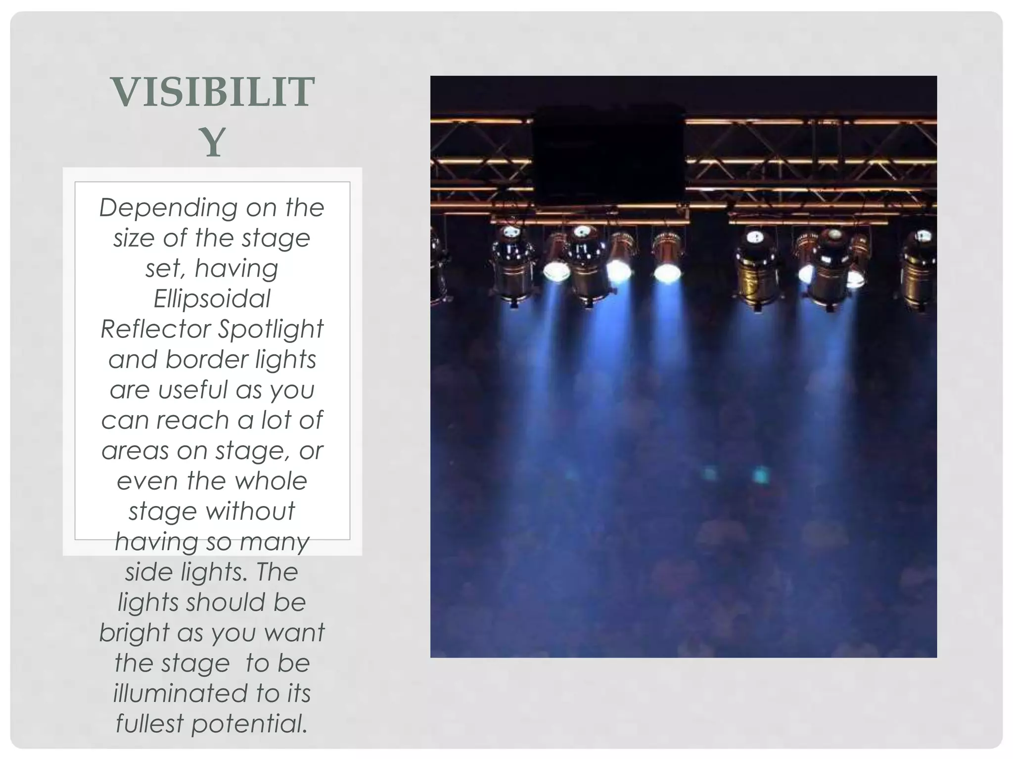 This document discusses different techniques for using lighting to enhance a stage production. It describes how ellipsoidal reflector spotlight and border lights can illuminate large stages. It also discusses using lighting color, intensity, distribution, and movement to set mood, style, and time of day. Specific examples are given, such as using softer yellow lights when characters kiss and red lights to convey a damning effect during an argument.