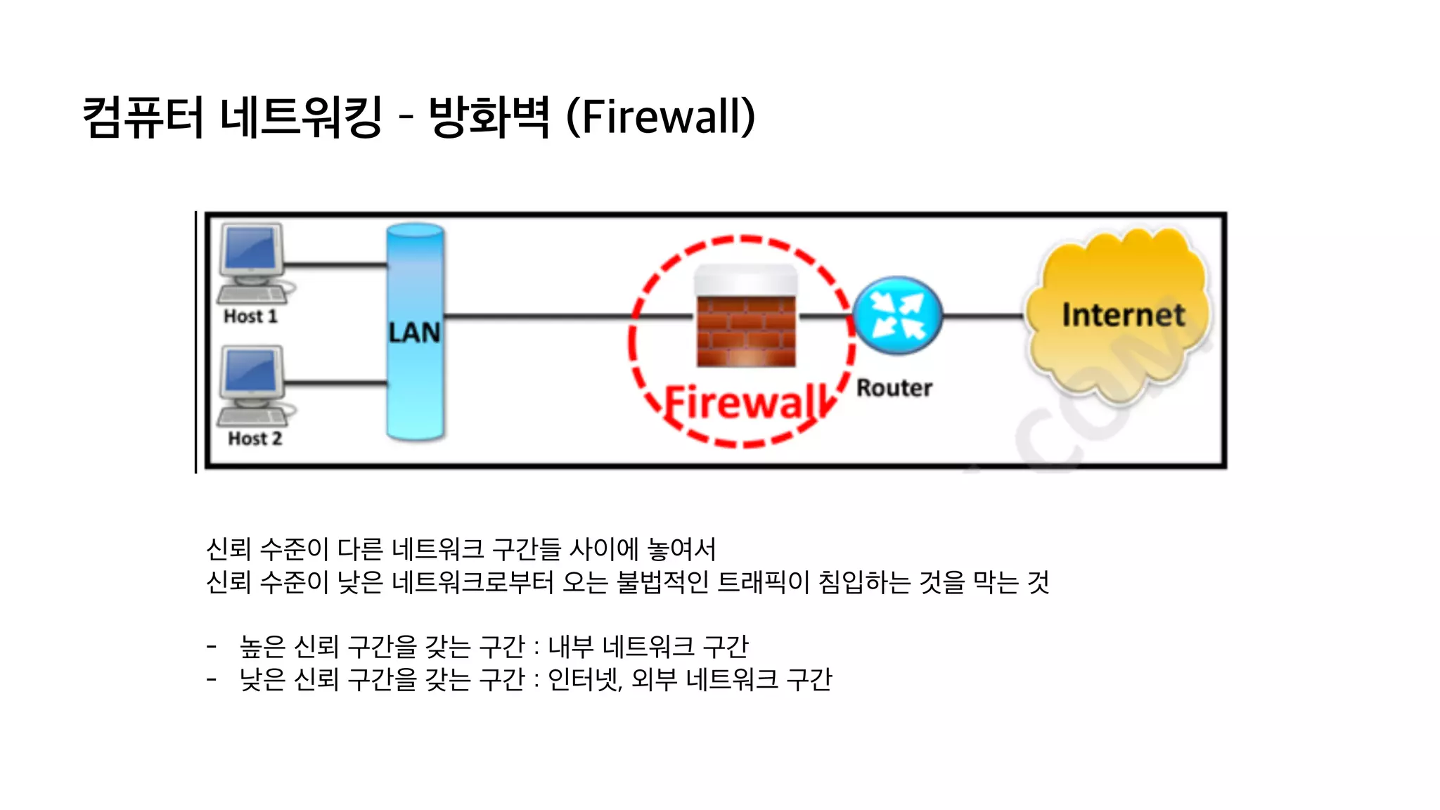 신뢰 수준이 낮은 네트워크로부터 오는 불법적인 트래픽이 침입하는 것을 막는 것