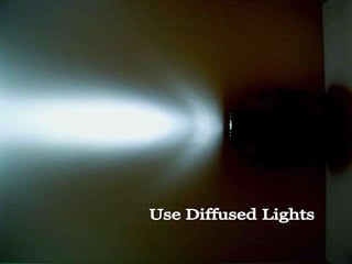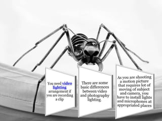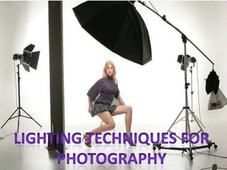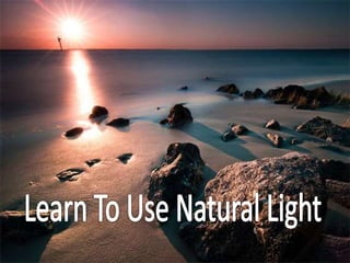 The document discusses techniques for photography using natural light, emphasizing the best times for shooting are morning and evening due to softer light. It advises on the placement of lights to enhance the subject and reduce shadows, suggesting the use of diffused lights for better texture. Additionally, it recommends taking sample shots to adjust the background and lighting setup before capturing the final images.