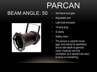 - A parcan produces a diffused light that adds depth and is used for general cover at music gigs. An LED par can change colors digitally and is more energy efficient.