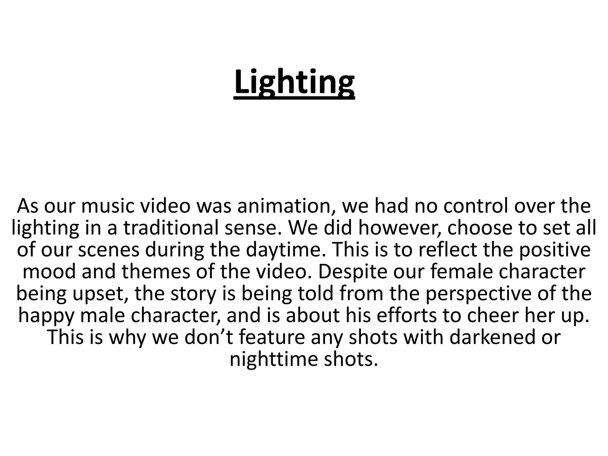 The music video was animated so the creators had no control over traditional lighting but chose to set all scenes during the daytime to reflect the positive mood and themes from the male character's perspective of cheering up the upset female character, avoiding any nighttime or darkened shots. Some lighting effects were incorporated, including zooming into an extreme closeup of the sun with a lens flare to transition to a new scene and adding a lens flare in the last scene as the sun descends to shine on a seed, brightening the scene to make it seem like the sun is shining.