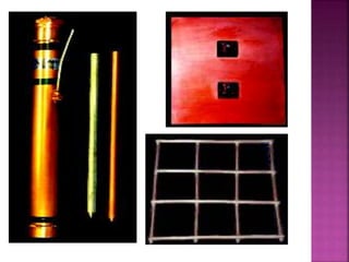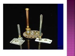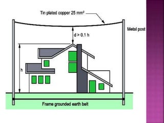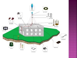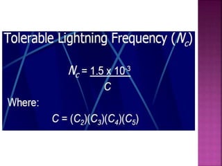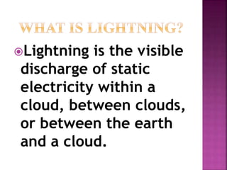Lightning is a visible discharge of static electricity that can occur within or between clouds or between the earth and a cloud. It is caused by high electrostatic stresses that ionize the air, allowing discharge between charged clouds and tall structures on the ground. A lightning protection system aims to safely intercept lightning strikes using air terminals, down conductors to direct current to ground terminals buried in the earth. The risk of lightning strikes on a structure is assessed using flash density maps and calculations of the equivalent collective area to determine if protection is required.