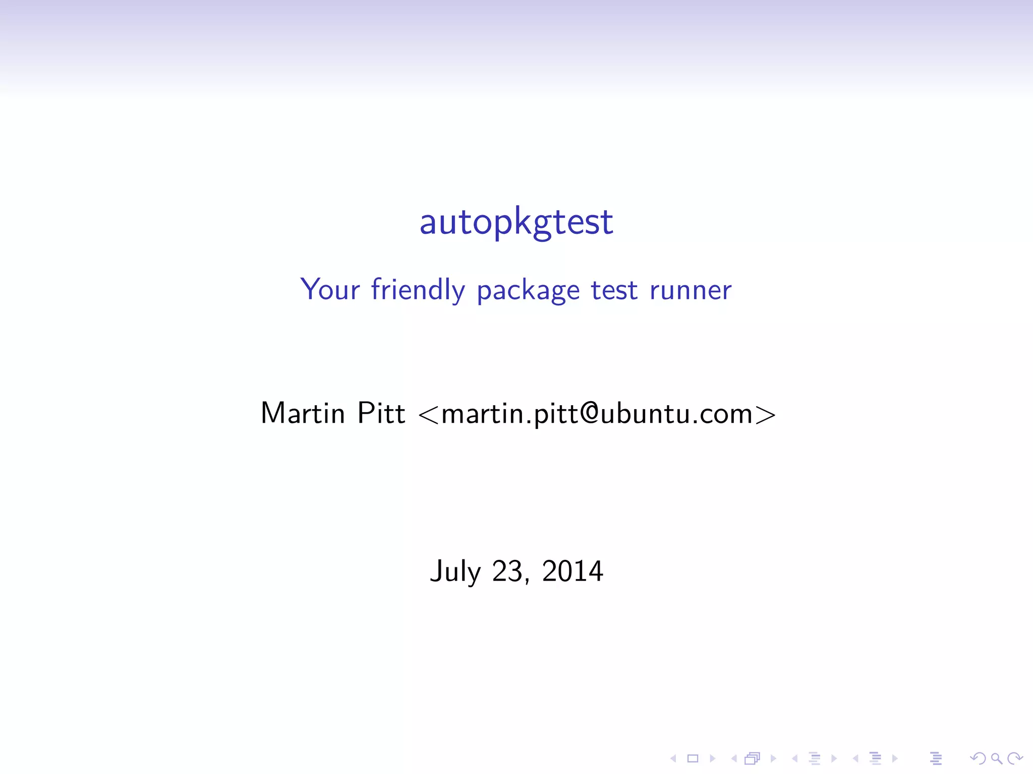 Autopkgtest is a tool for running package tests on Debian and Click packages. It supports running tests in various testbeds like QEMU, LXC, and SSH. Tests can be defined using metadata in the package or via an "x-test" section in the Click manifest. Autopkgtest is useful for continuously running package tests during the build process to catch regressions. It provides results to help ensure packages are functioning as expected.