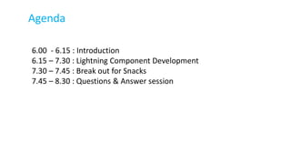 The document summarizes an inaugural meetup of the Mumbai Salesforce Developers Group on Lightning Component Development. The agenda includes an introduction to Lightning components, their architecture, and a hands-on building of a sample component to fetch Account records. Tools for Lightning development and notable resources like videos and blogs are also listed.