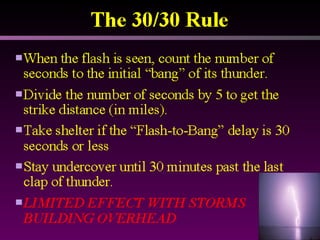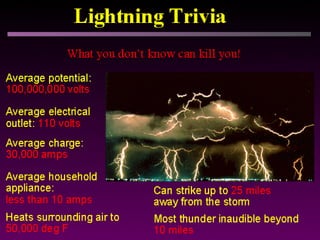 The document provides information on lightning safety. It discusses unsafe and safe areas during lightning, lightning myths and facts, first aid for lightning strikes, and tips for outdoor lightning safety. Statistics show that most lightning victims survive but 25% die, and certain groups like young men engaged in outdoor activities are at higher risk of lightning strikes.