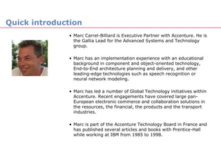 The document provides an overview of scaling agile practices across distributed teams. It discusses Marc Carrel-Billiard's background and experience at Accenture. It then outlines how two projects at Digiplug, a Digital Supply Chain project and Retail Services Platform, implemented distributed agile practices with offshore teams to achieve mature agile delivery. Key steps included starting with offshore teams in development and testing, then scaling up the offshore teams and distributing operations and design experts.