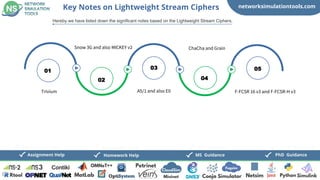 The document outlines various lightweight cryptography projects, detailing significant lightweight stream ciphers, hash functions, and block ciphers. It provides an overview of notable algorithms like Trivium, ChaCha, and Keccak. Additionally, it offers resources for PhD and MS guidance as well as homework help related to these cryptographic concepts.
