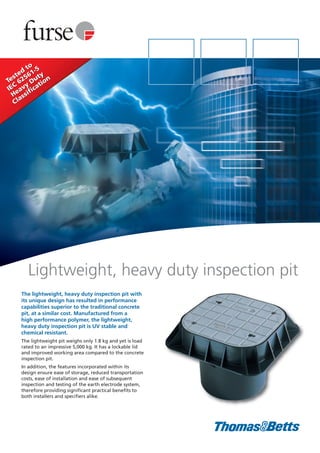 The lightweight, heavy duty inspection pit is made of a high performance polymer that is UV stable, chemical resistant, and lighter than a traditional concrete pit. It can support up to 5,000 kg yet only weighs 1.8 kg. The pit has a lockable lid and larger working area than concrete pits. Its design allows for easy storage, transportation, installation, and inspection of earth electrode systems, providing benefits over concrete pits for installers and specifiers.