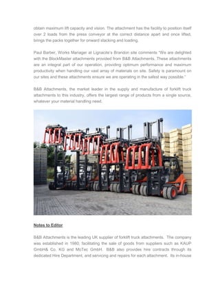 This press release announces that Lignacite, a UK manufacturer of masonry products, has purchased 10 TB3245 BlockMaster forklift truck attachments from B&B Attachments to assist with operations at their Essex and Suffolk manufacturing sites. The TB3245 attachment is designed specifically for Lignacite's manufacturing process and allows operators to consolidate two loads of blocks from the conveyor and stack them more efficiently. Lignacite's works manager commented that the attachments provide optimum performance and safety. B&B Attachments is a leading supplier of forklift truck attachments in the UK.