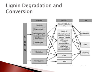 The document discusses various methods for converting lignin derived from biomass into valuable products such as fuels and chemicals. Key methods discussed include pyrolysis, gasification, hydrogenolysis, oxidation, and reactions under supercritical conditions. Catalytic processes can aid in selectively breaking lignin bonds to produce specific compounds. Overall the document provides an overview of the technical challenges around utilizing lignin and some potential pathways and research toward making it a more valuable resource.