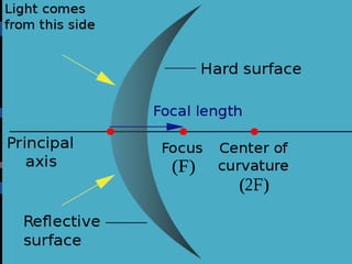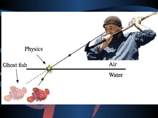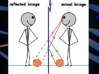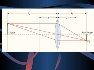 The document discusses the laws of reflection and refraction of light. It defines reflection as light bouncing back and describes the law of reflection which states that the angle of incidence equals the angle of reflection. Reflection can be specular from smooth surfaces or diffuse from rough surfaces. Reflection of light rays from spherical mirrors follows specific rules depending on whether the mirror is concave or convex. Refraction is defined as the change in direction of a light ray when passing from one medium to another. Snell's law relates the angles of incidence and refraction, with the ratio of their sines being a constant called the refractive index. Lenses use refraction to form real or virtual images depending on whether the lens is converging or diver