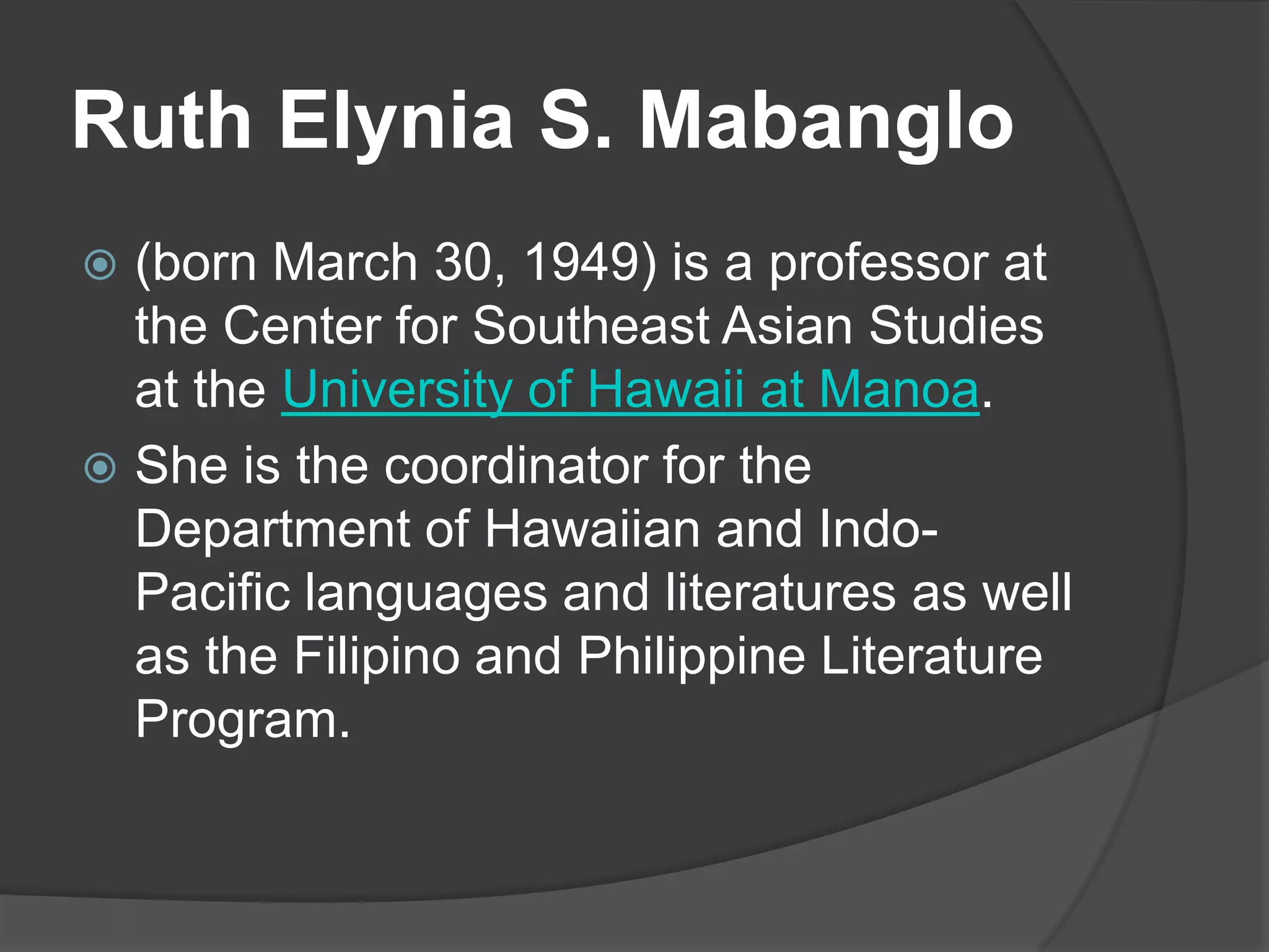 Si Ruth Elynia S. Mabanglo ay isang propesor sa University of Hawaii at may dalawampung taon na karanasan sa larangan ng pagsusulat at edukasyon. Siya ay nag-publish ng maraming mga akda at nakatanggap ng maraming parangal, kabilang ang Don Carlos Palanca Memorial Awards. Ang kanyang tula ay madalas na naglalarawan ng mga hamon at karanasan ng mga kababaihan sa ilalim ng tradisyunal na mga inaasahan at tungkulin sa pamilya.