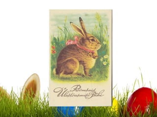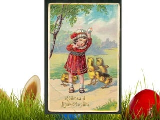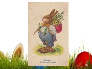 The document discusses Easter traditions in Estonia. It explains that Easter has many names in Estonian, including Muna pühad, Kiige pühad, and Ülestõusmispühad. It is a movable feast celebrated seven weeks after Shrove Tuesday. Symbols of Easter include eggs, rabbits, spring grass, pussy willows, and daffodils. Traditional Easter customs involve dyeing and giving eggs, egg games, and going to church services. The Easter Bunny also hides eggs for children to find.