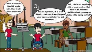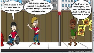 The document discusses a comic strip created by the D class of 1st & 12th primary schools in Karditsa, Greece during the 2013-14 academic year. It includes links to three YouTube videos titled 'like a...choir,' 'we are all friends,' and 'all europe together.' These resources appear to showcase the students' work and themes of friendship and unity.
